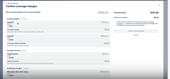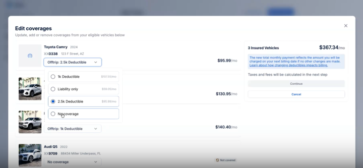 Once you click "Edit Coverage," you can locate the vehicle, select the car's coverage from the drop-down, and add it to your plan. Please note: If the car states "No Coverage," it has not been added to your policy yet; coverage must be selected from the drop-down menu for it to be added.